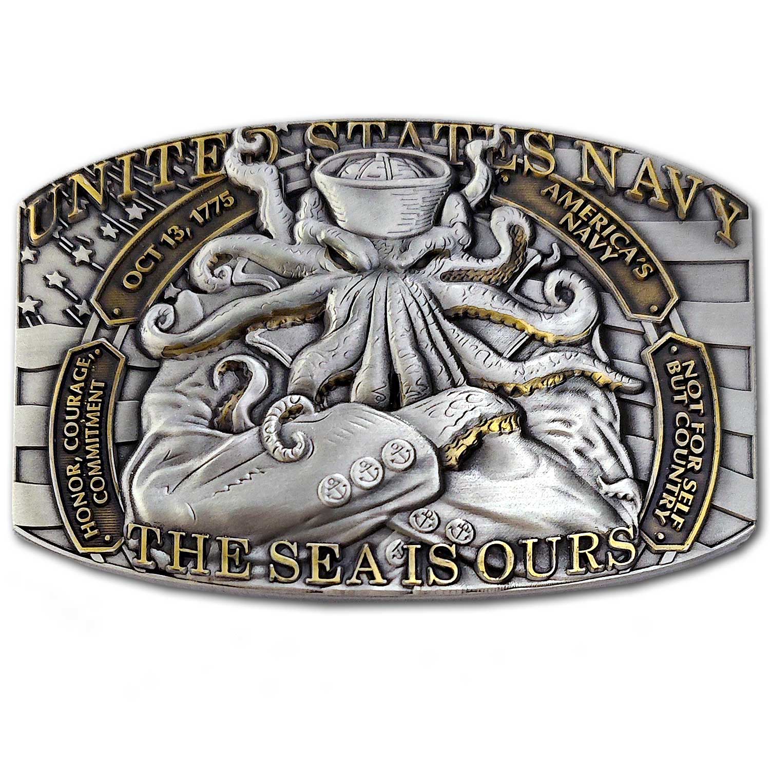 Inspired by the men and women of the United States Navy comes this Navy Squid The Sea Is Ours Veteran Belt Buckle. At 3 inches in width by 2.5 inches high and built with the buckle device for easy wear with uniform this 6mm thick buckles has the original look and feel of an amazing US Navy belt buckle design. Cast molded out of zinc this Jolly Roger The Sea Is Ours US Navy Belt Buckle is designed and plated with two toned silver and gold antique colors it is truly an exceptional quality design. With the original artwork of Military-Outfitters.Com they are exclusively offered here.