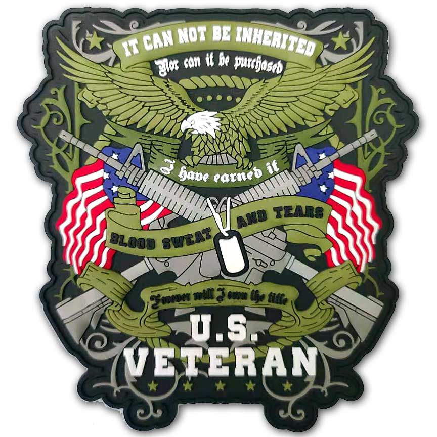 US Veteran Blood Sweat Tears Patriotic Military Morale PVC Patch designed with original artwork. This PVC military patch features crossed M-4 rifles, US flags, dog tag, American bald eagle and banners featuring the words “It Can Not Be Inherited” and “Forever Will I Hold the Title”. This 5 inch military PVC patch is unique and exclusively offered here. Each morale patch comes with male hook and loop backing. Our small US Veteran company focuses on original art and design offering only the newest concepts for the US military, Veterans, prior service, friends and family of the US military. Check out more of our military morale PVC patches.